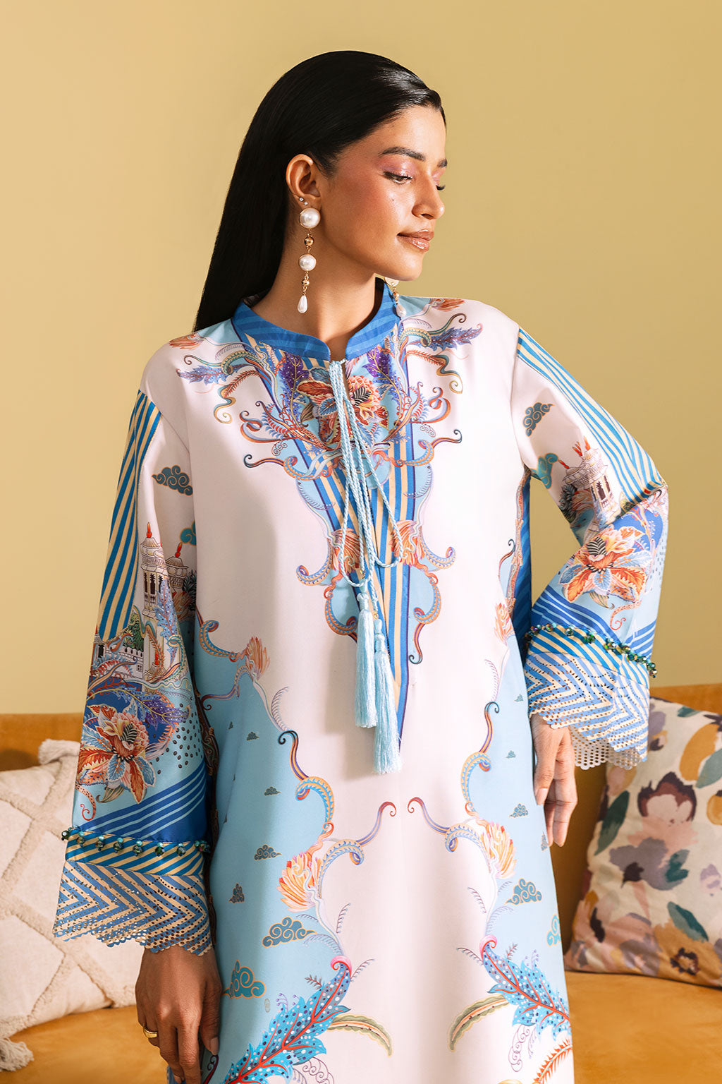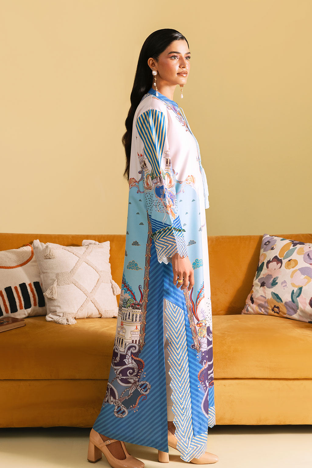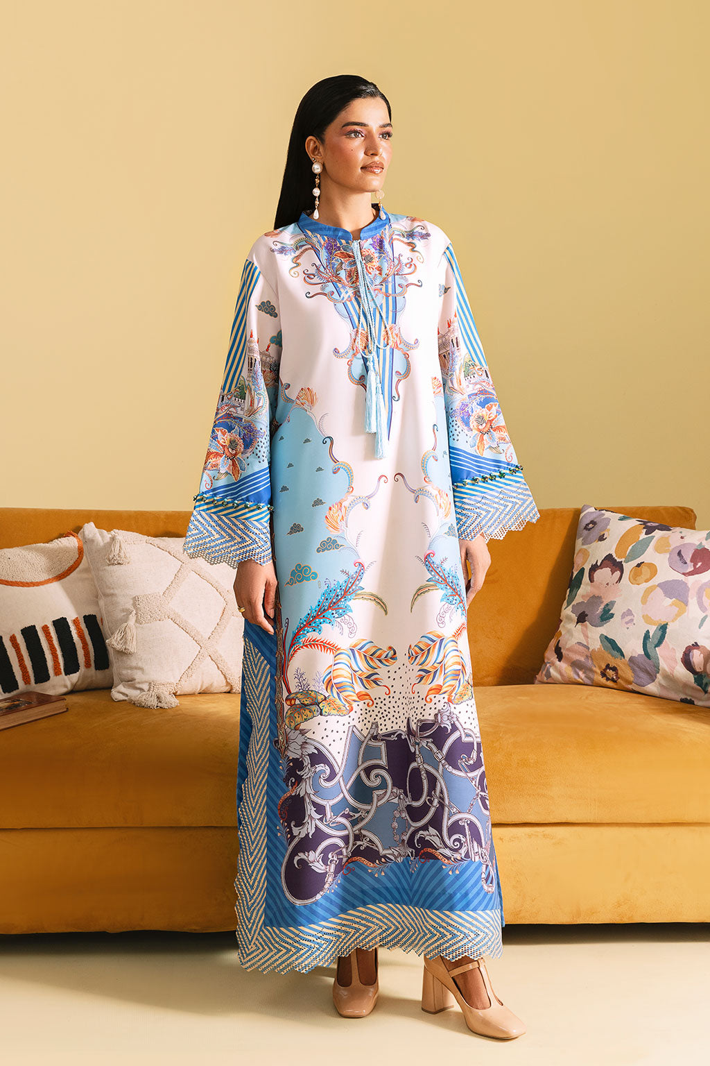 Off-white kaftan set adorned with bright floral prints, Features a long shirt with neckline and