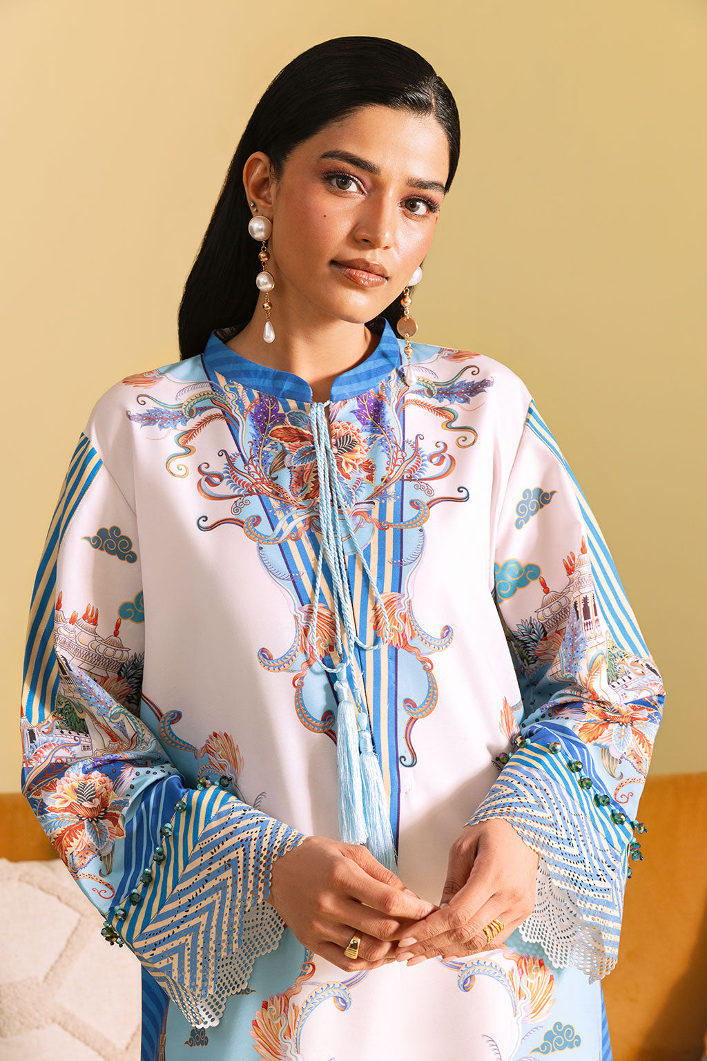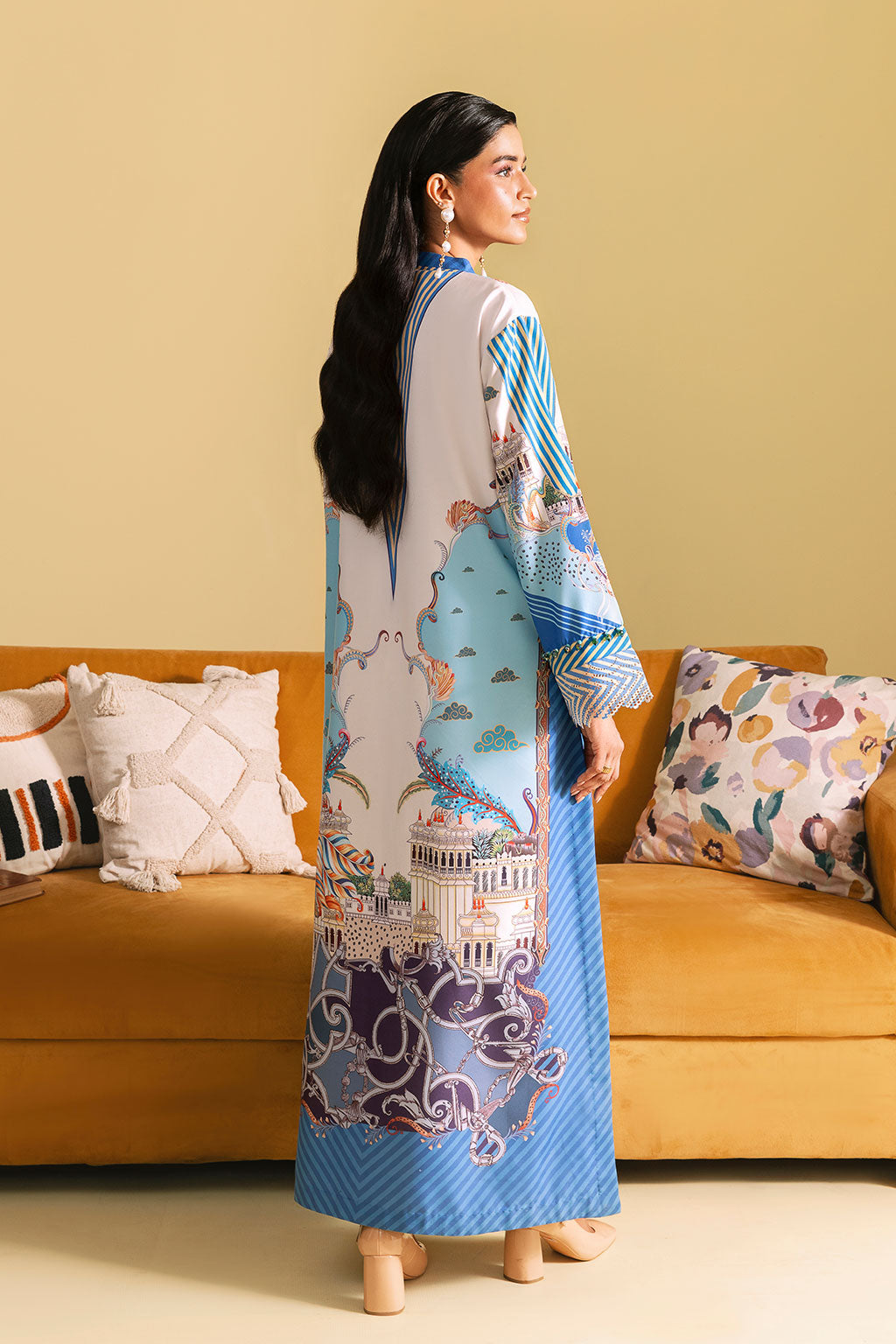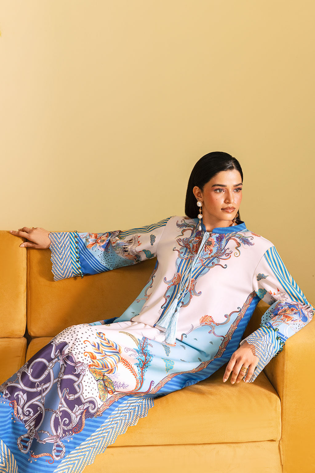 Off-white kaftan set adorned with bright floral prints, Features a long shirt with neckline and
