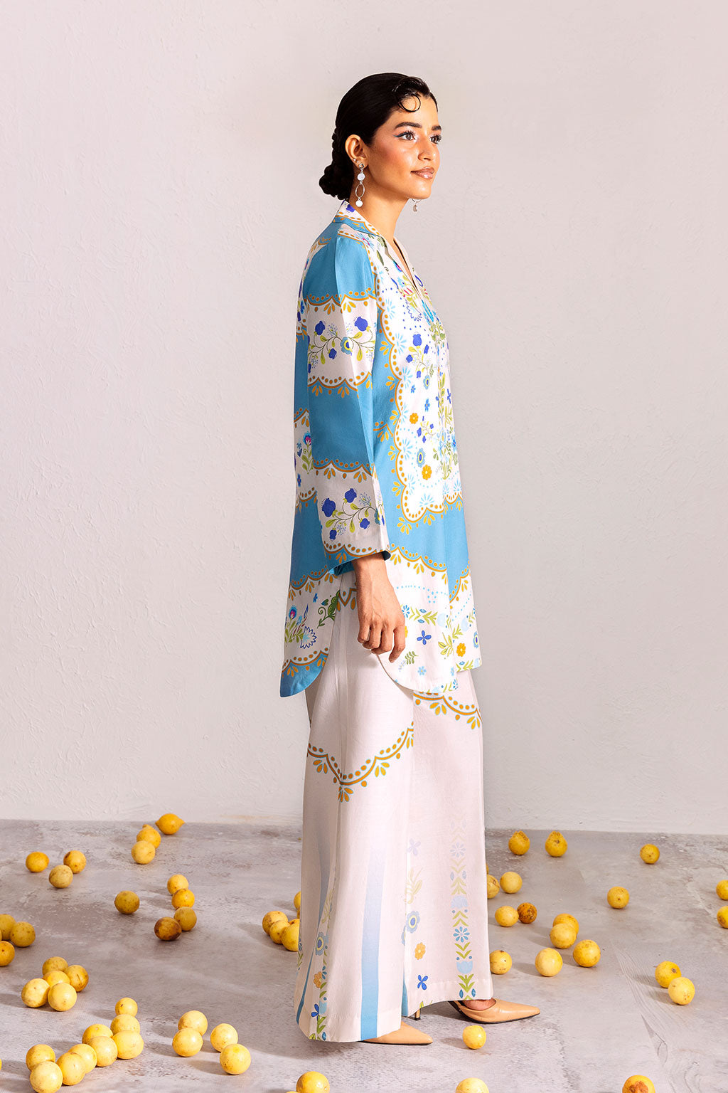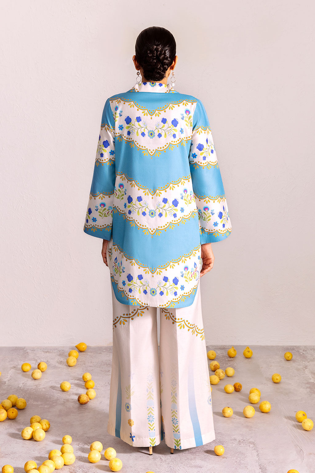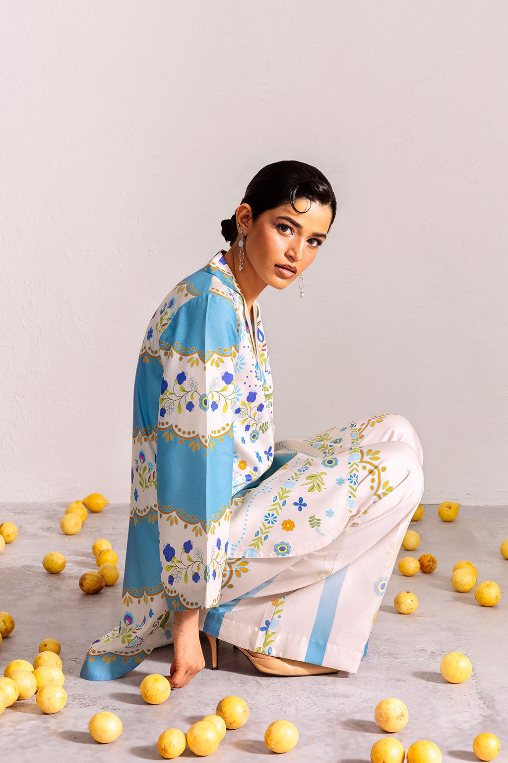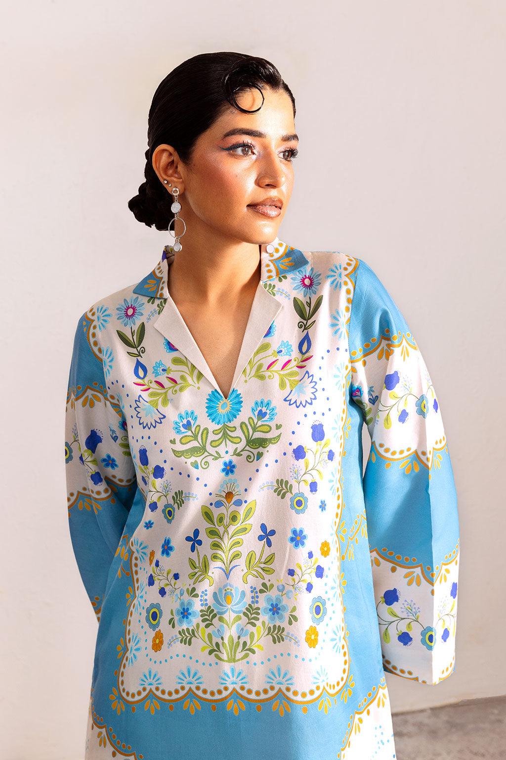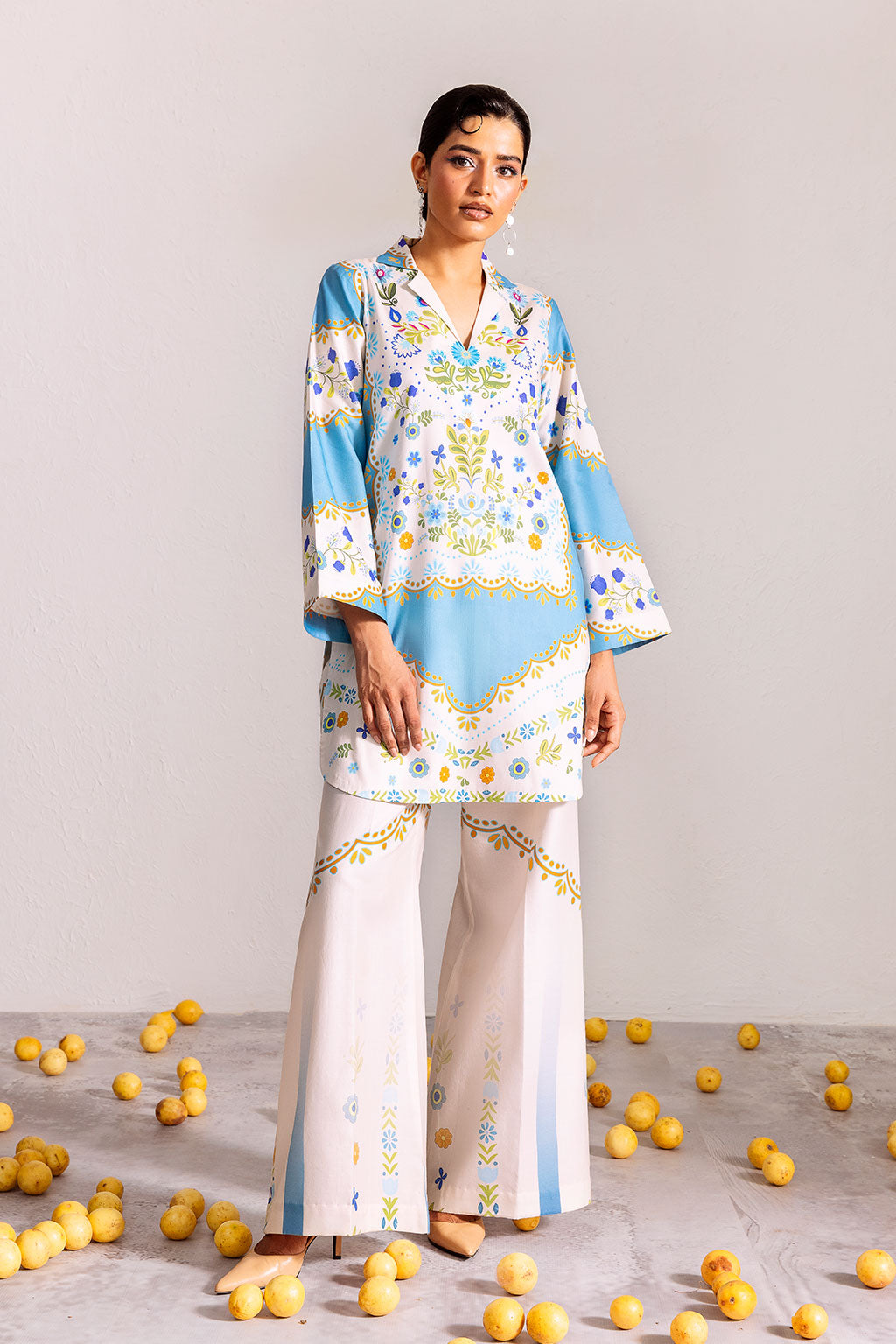Chic sky-blue and white two-piece with vibrant floral motifs and geometric accents, exuding a fresh, modern vibe.