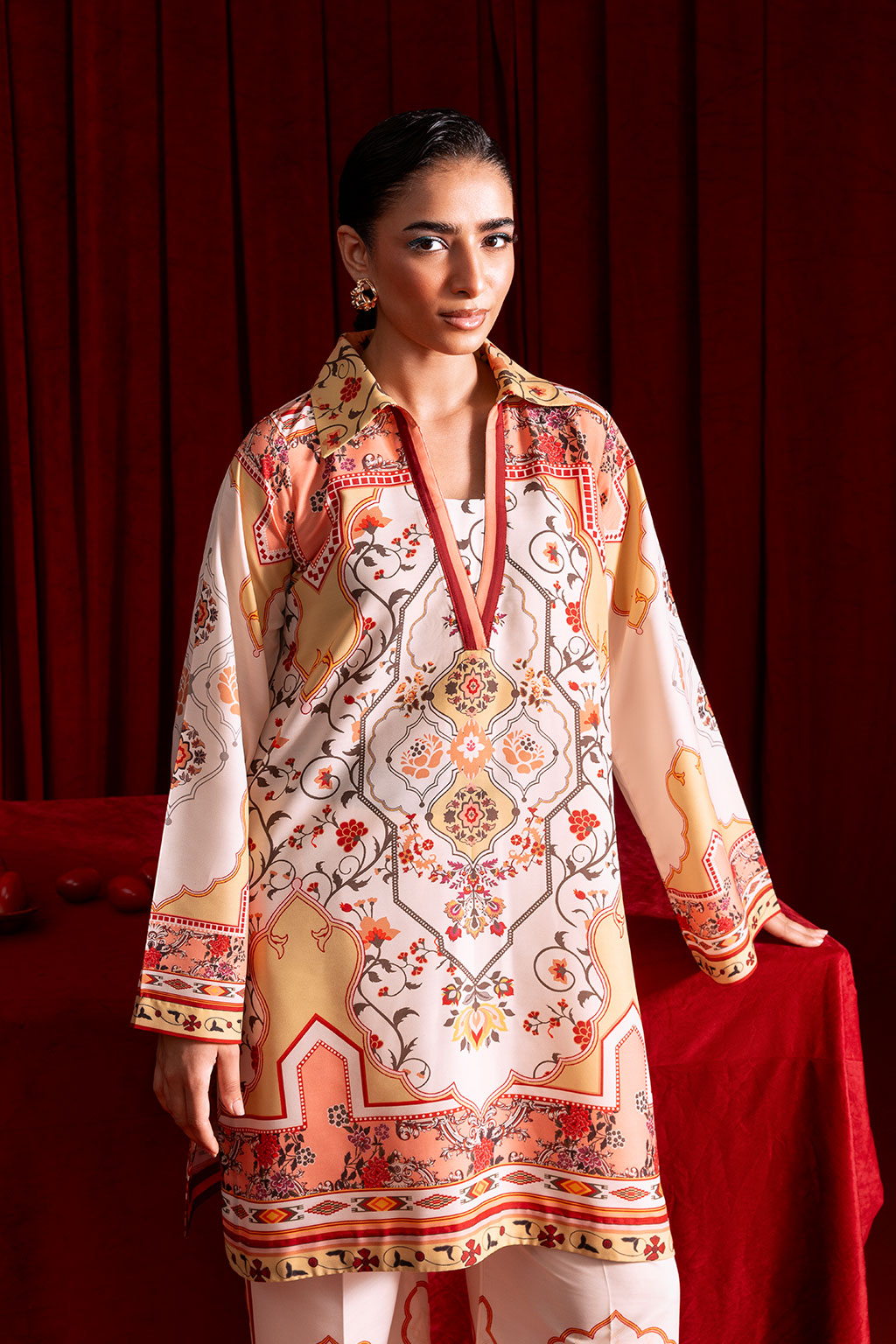 A blush pink Co-ord set adorned with bright floral prints, Features a shirt with neckline and