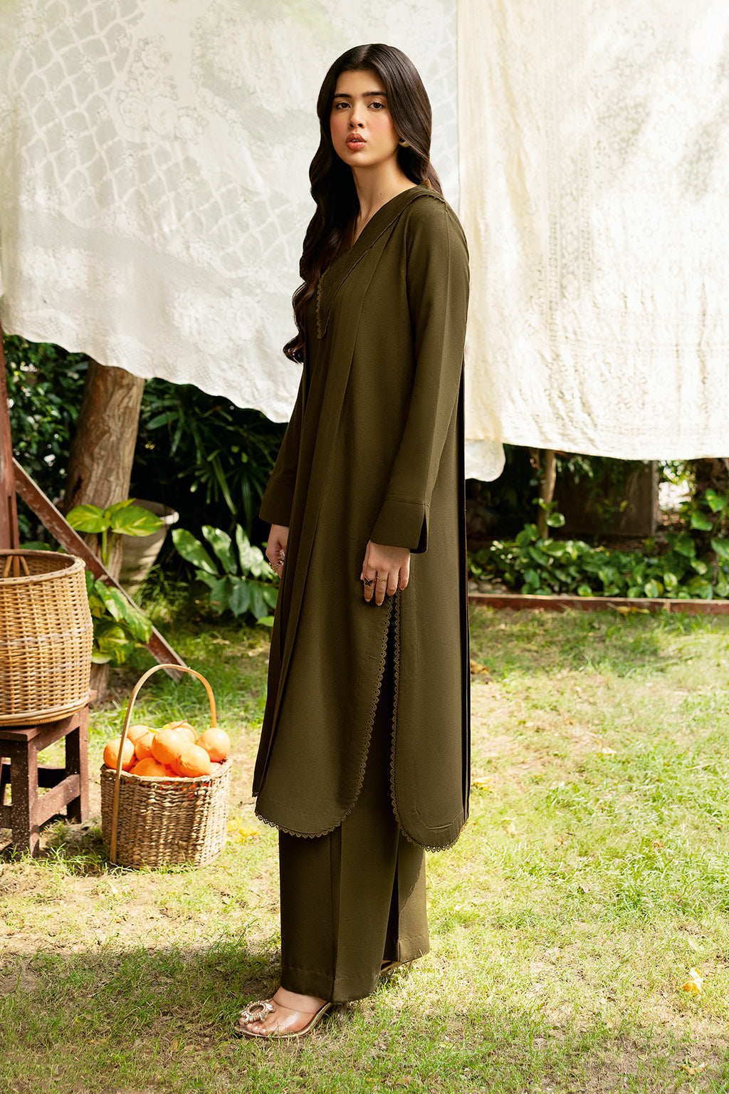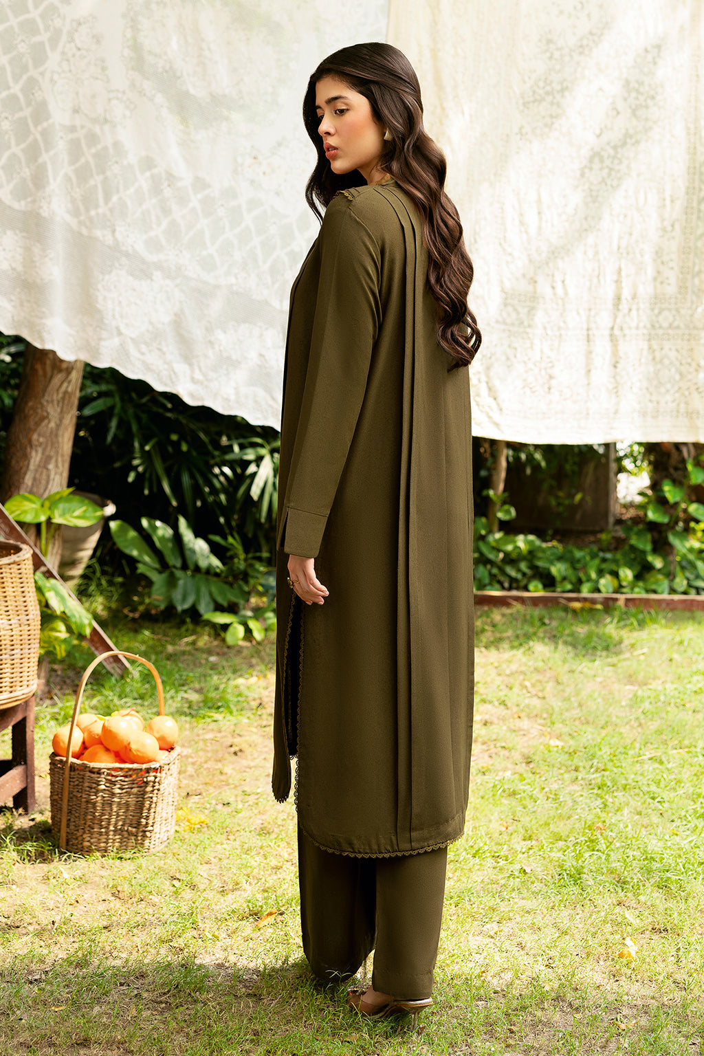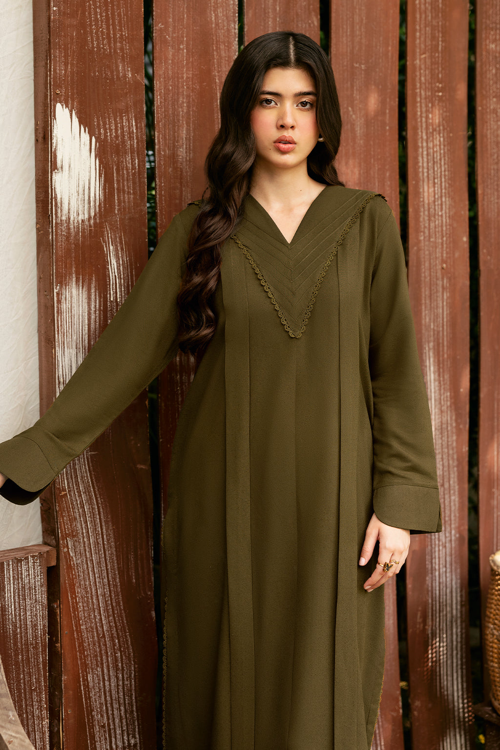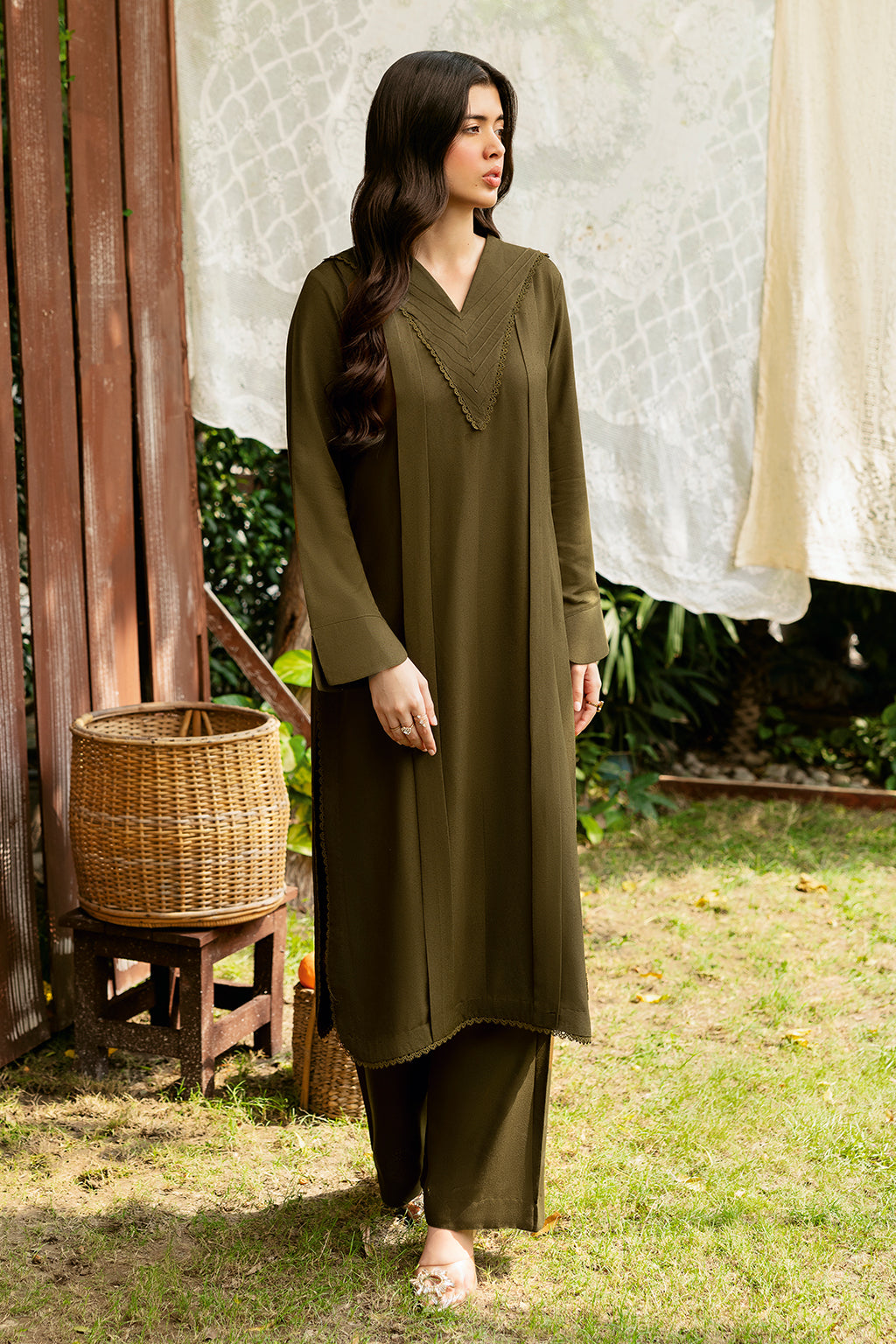 The Olive green Set Includes a solid shirt and pants with a V neckline—pure premium karandi with a subtle sheen produced in-house!