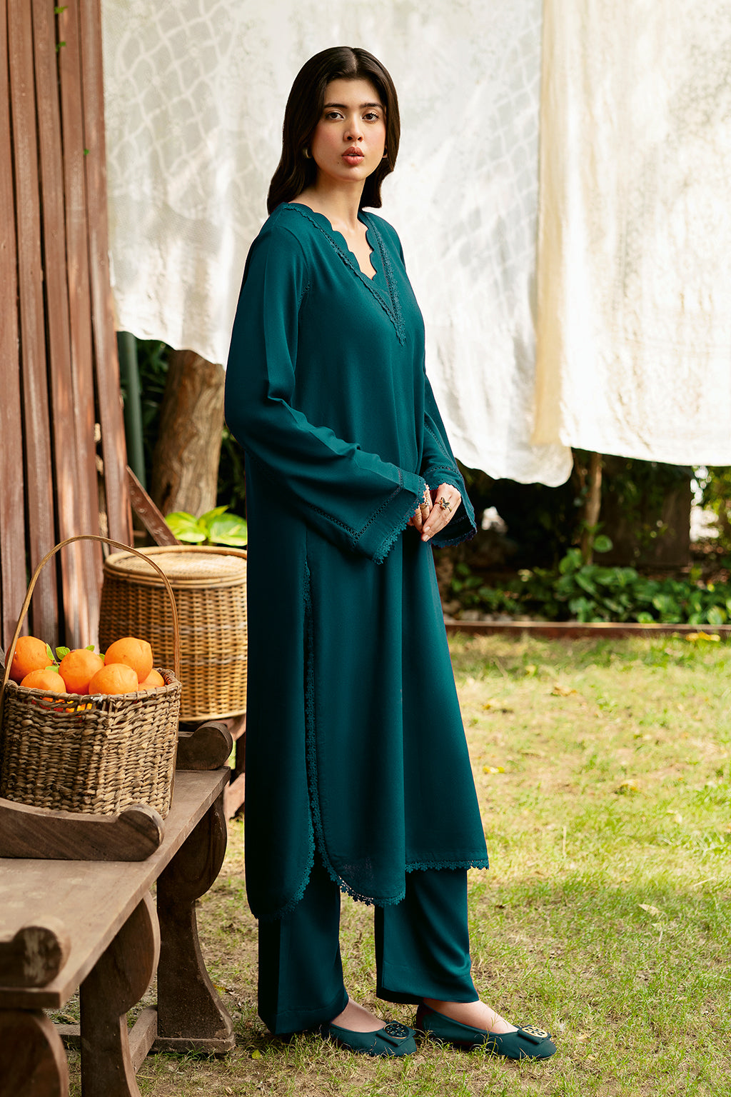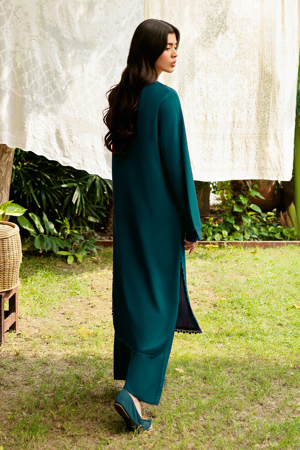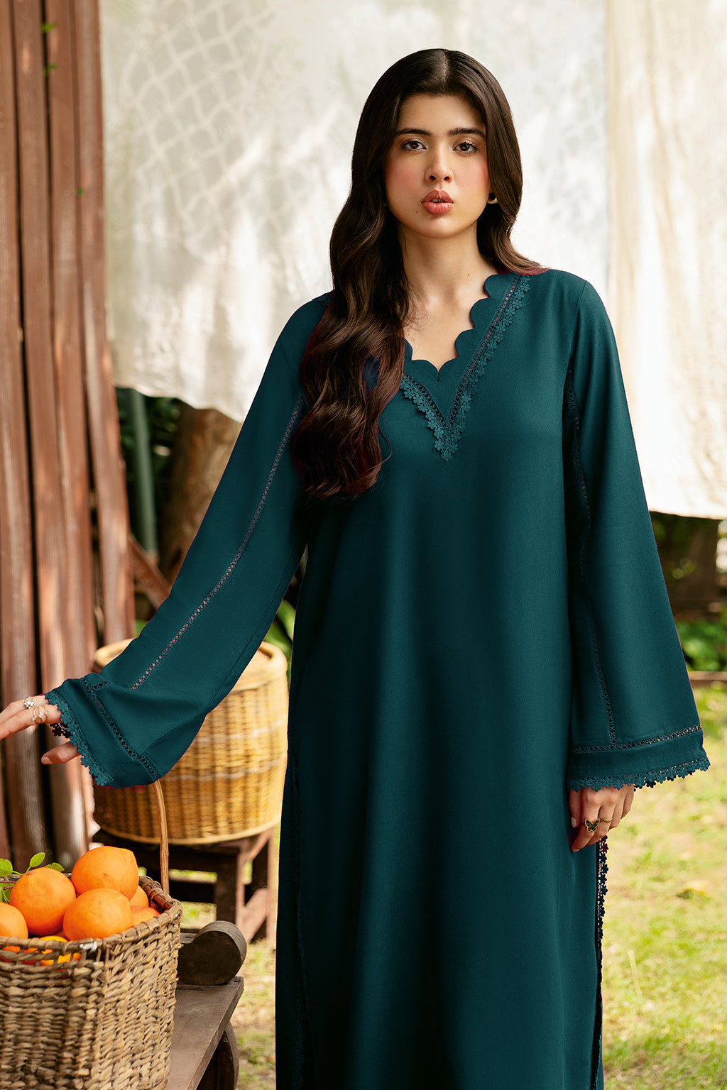 Zinc Set Includes solid shirt and pants with the v-neckline embossed with scalp and lace - Pure premium karandi with a subtle sheen produced in-house!