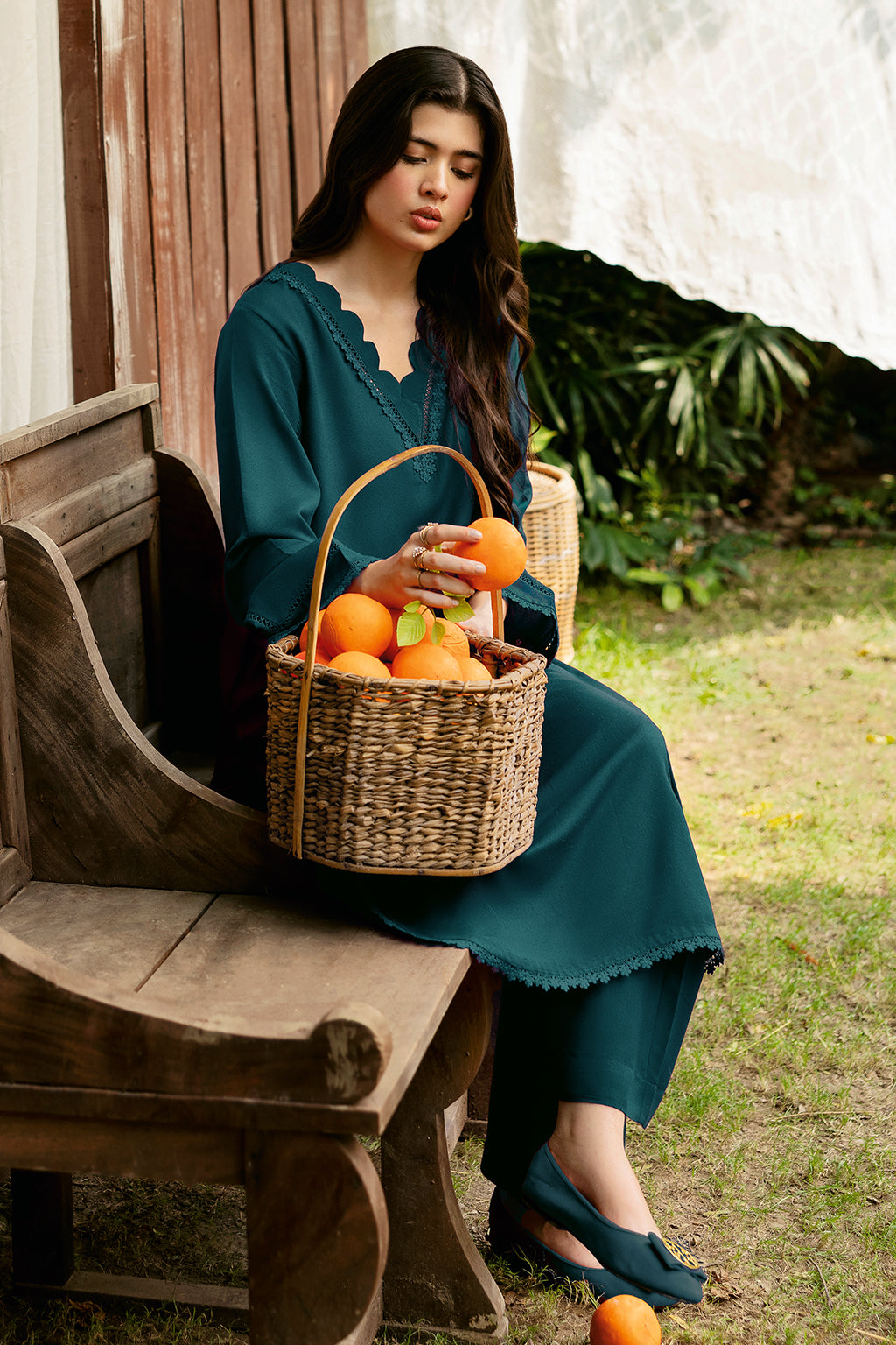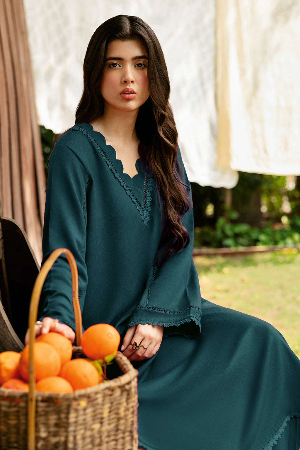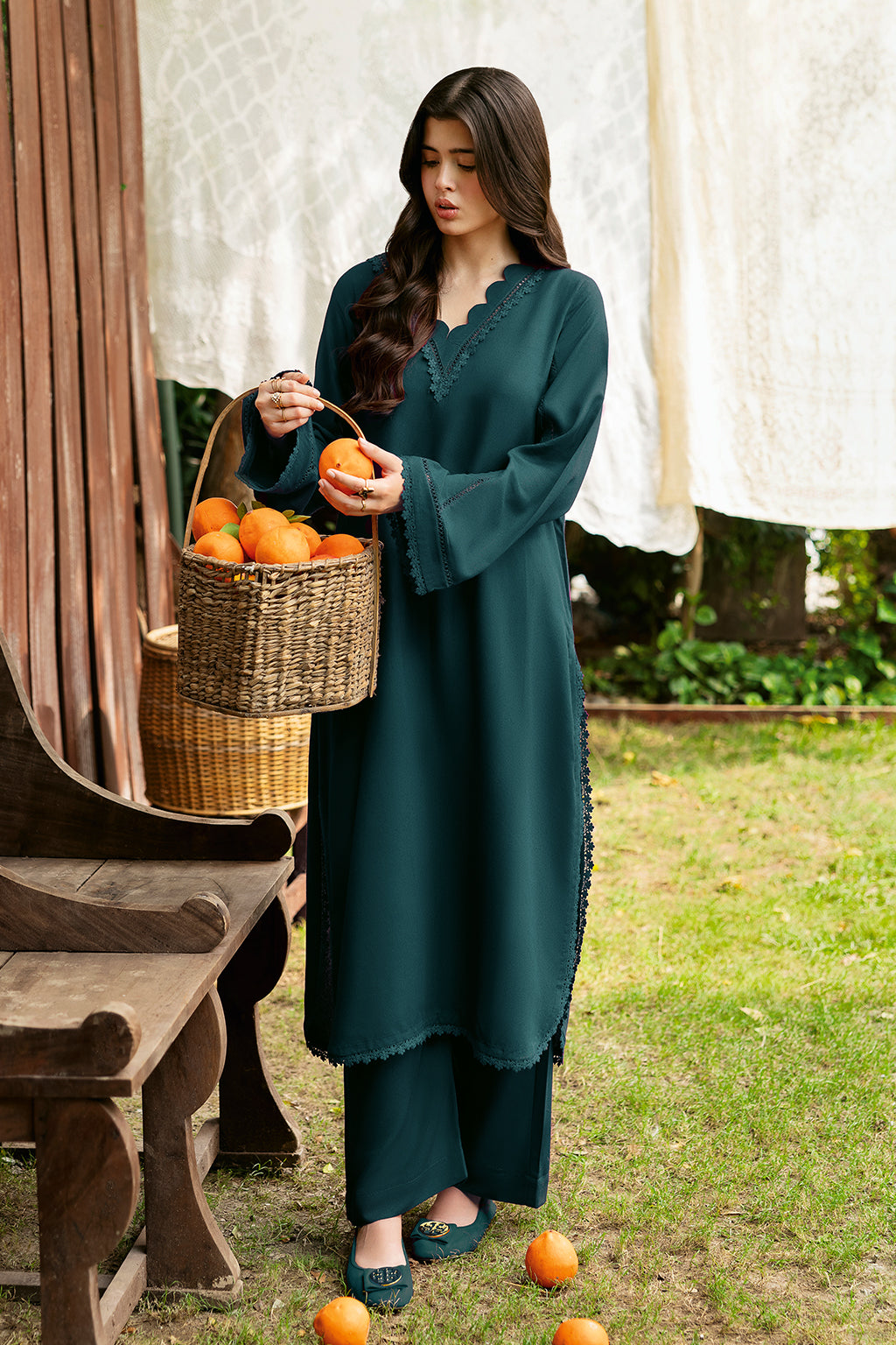 Zinc Set Includes solid shirt and pants with the v-neckline embossed with scalp and lace - Pure premium karandi with a subtle sheen produced in-house!