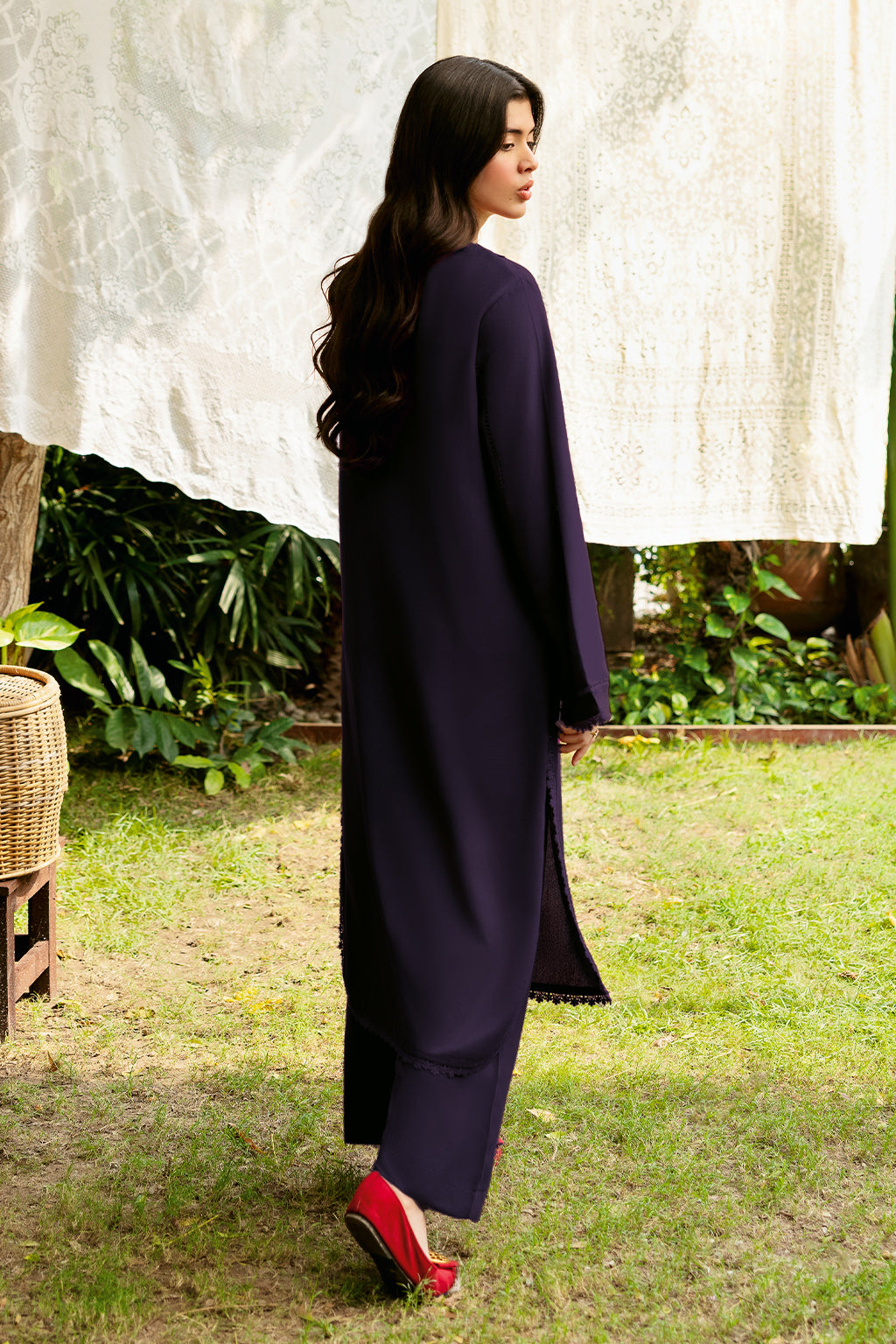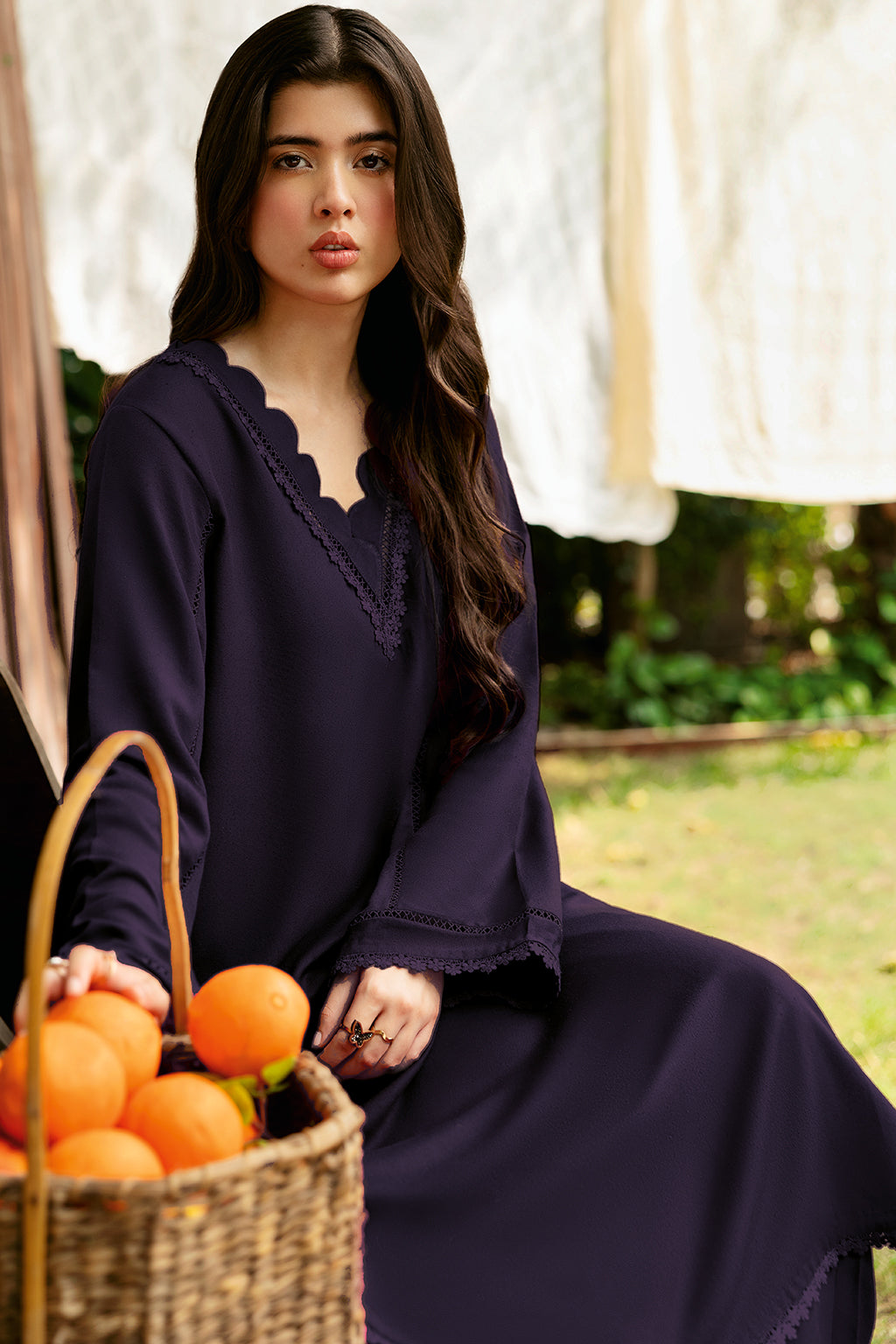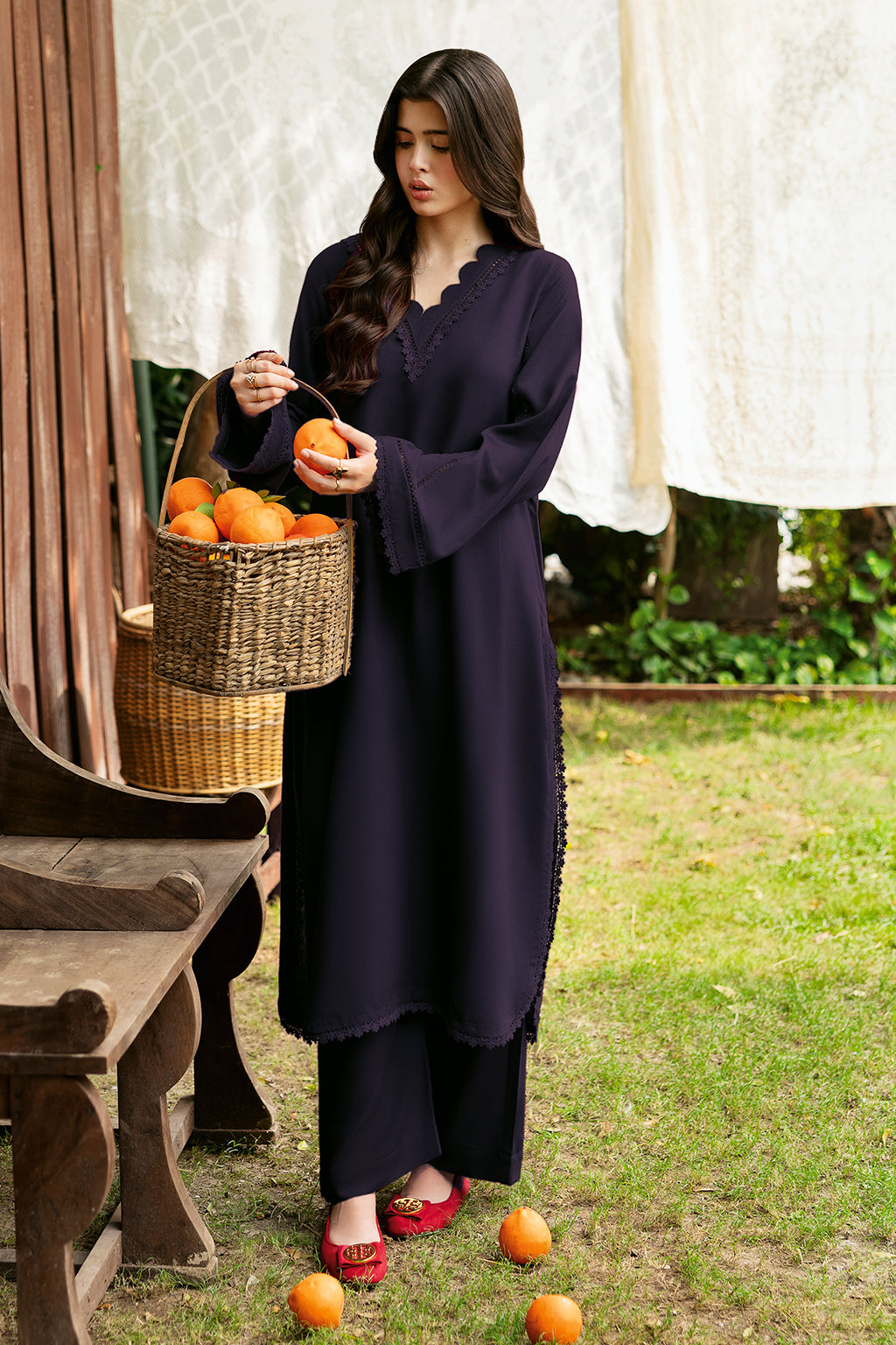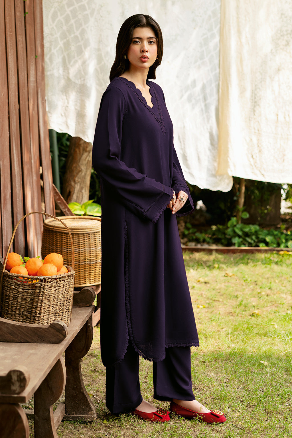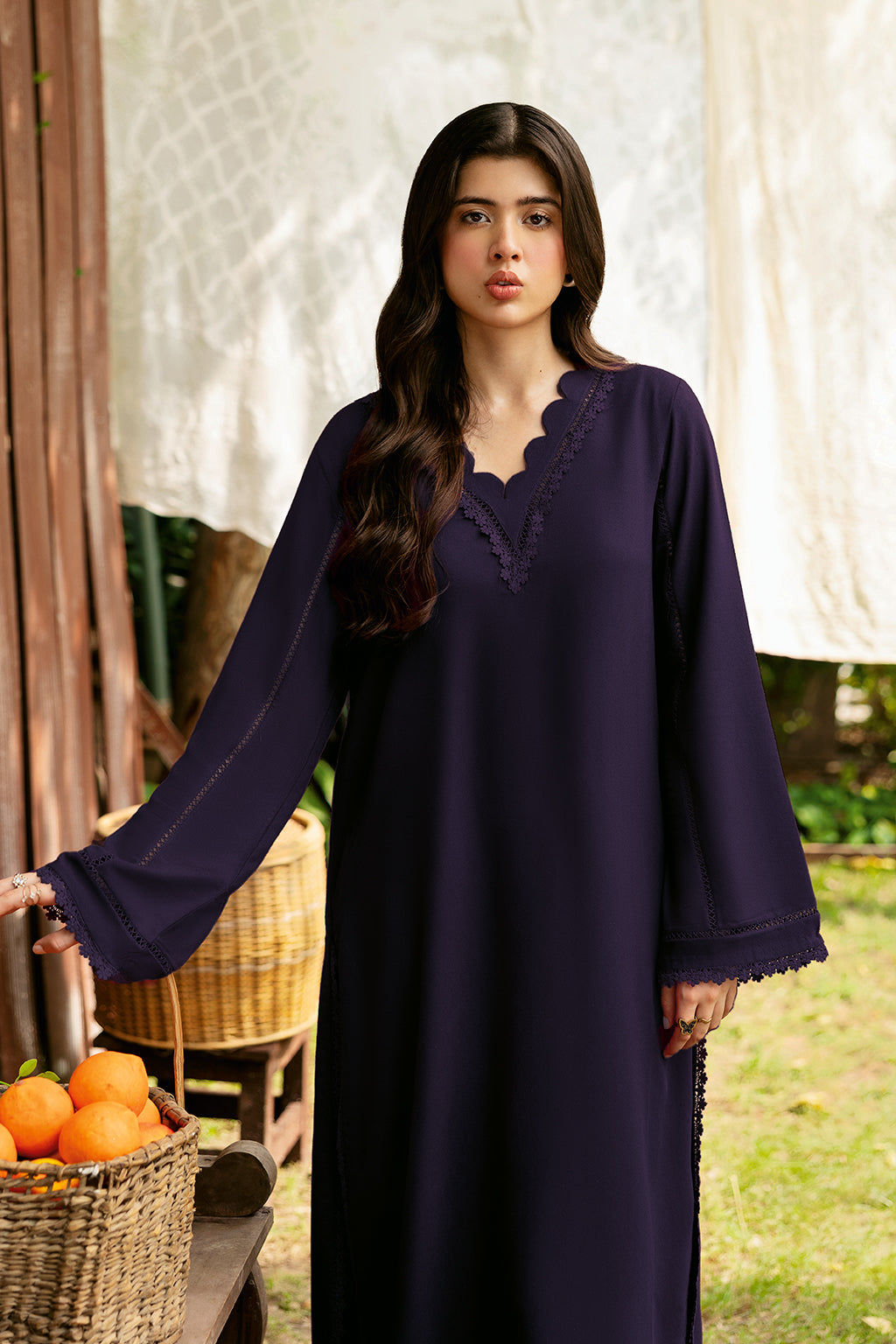 Set Includes solid shirt pants with the v-neckline embossed with scalp and lace - Pure premium karandi with a subtle sheen produced in-house!