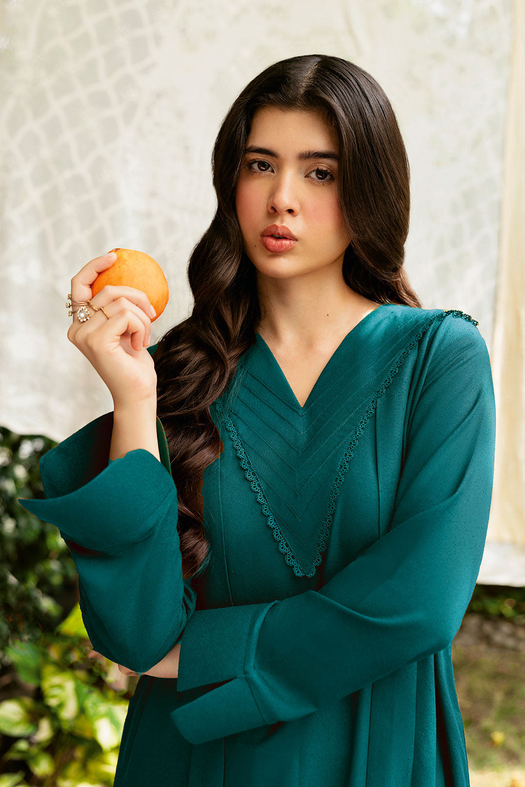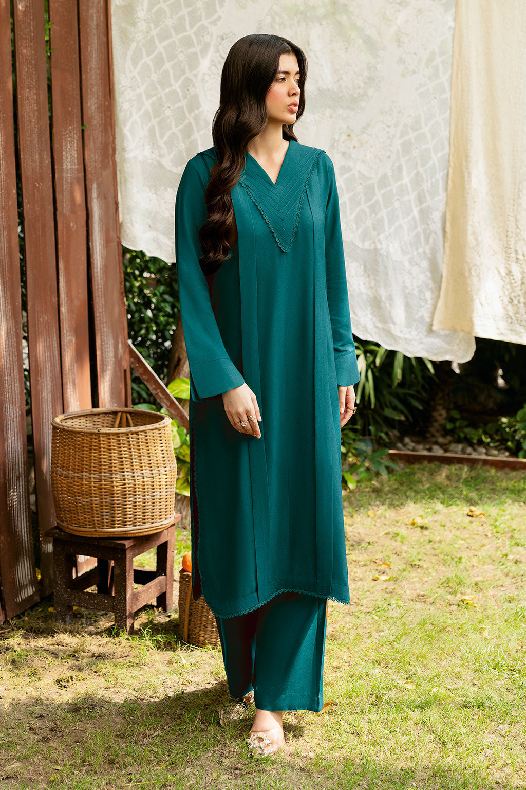 The Sea green set includes a solid shirt and pants with a V neckline - Pure premium karandi with a subtle sheen produced.