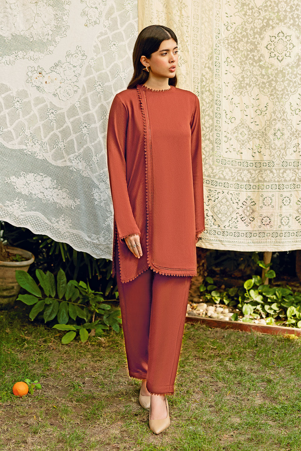 Rust set includes solid shirt pants with round neckline with front slit - Pure premium karandi with subtle sheen produced in - house!