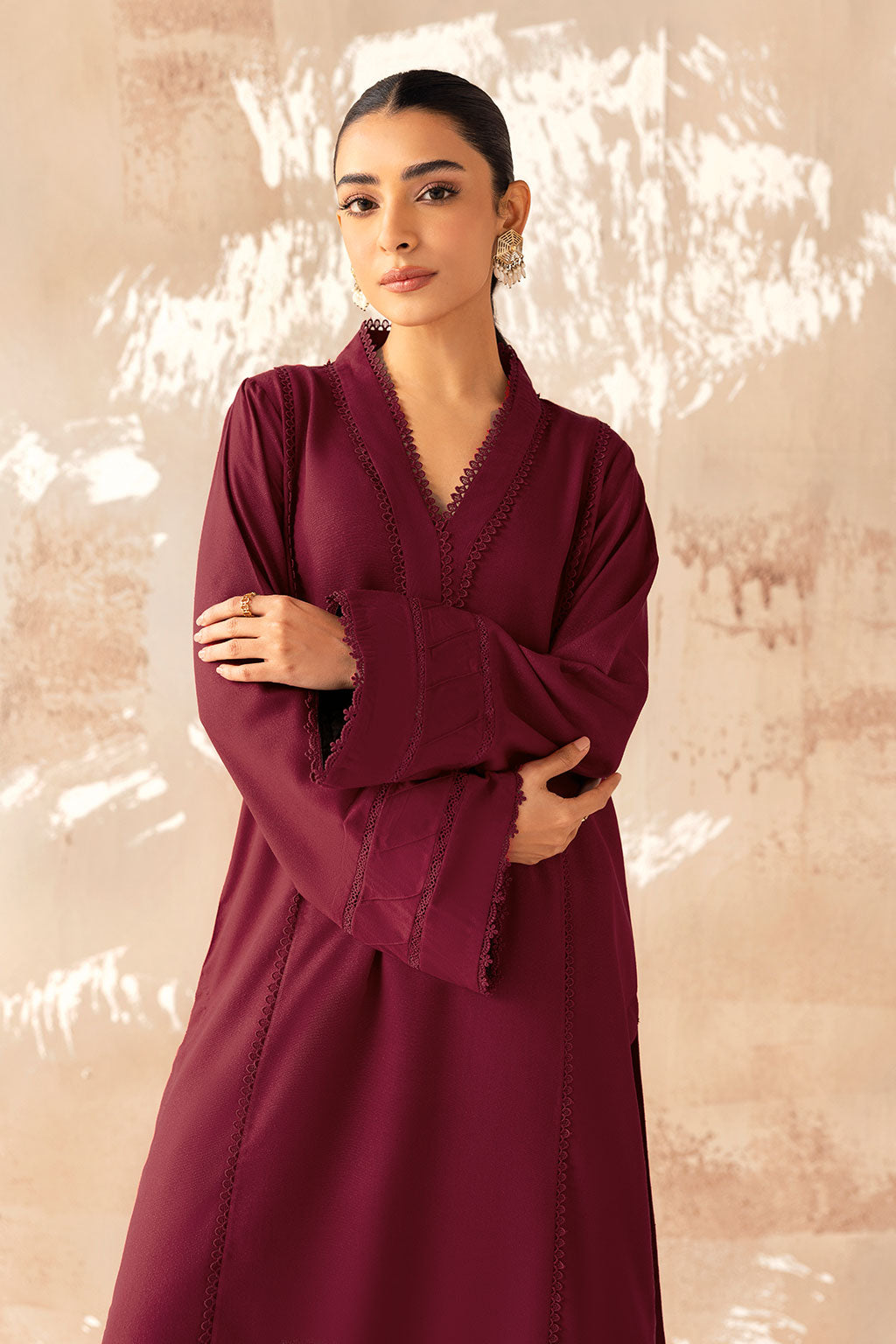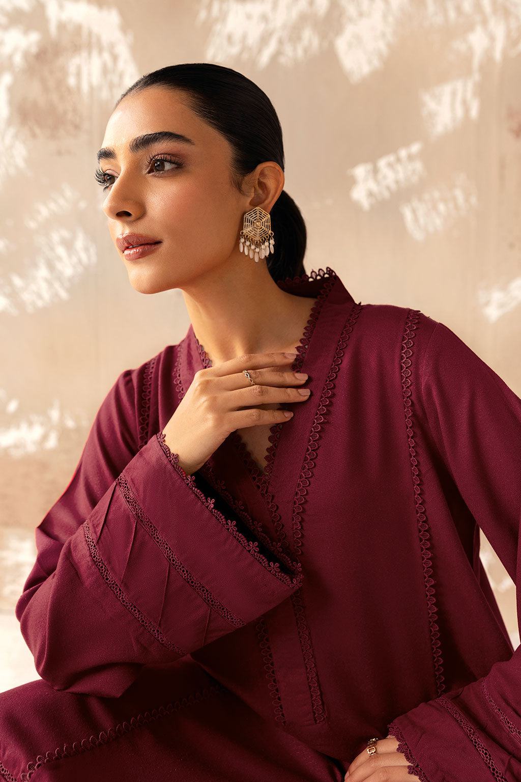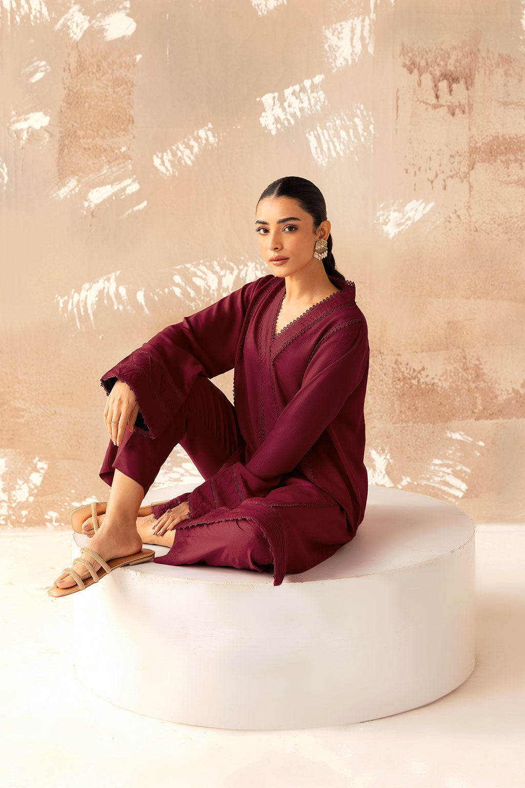 Effortlessly elegant, this deep maroon karandi outfit redefines winter grace with its sleek cut and refined detailing. A perfect blend of warmth and sophistication.
