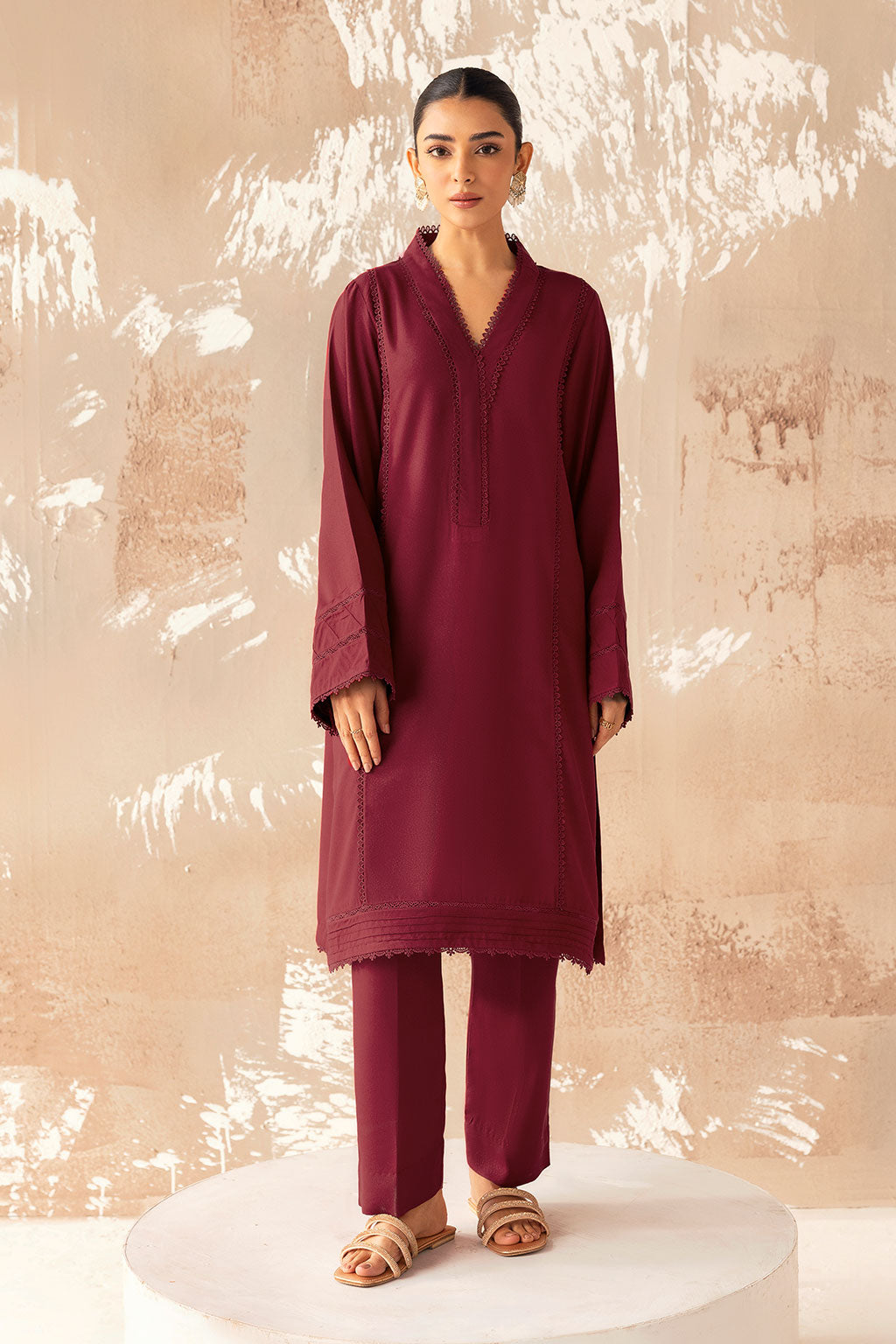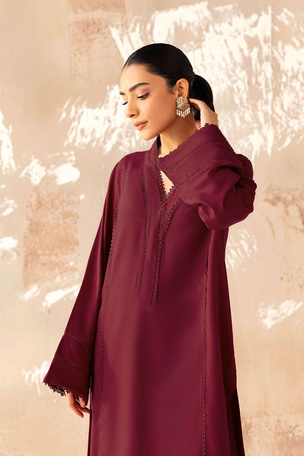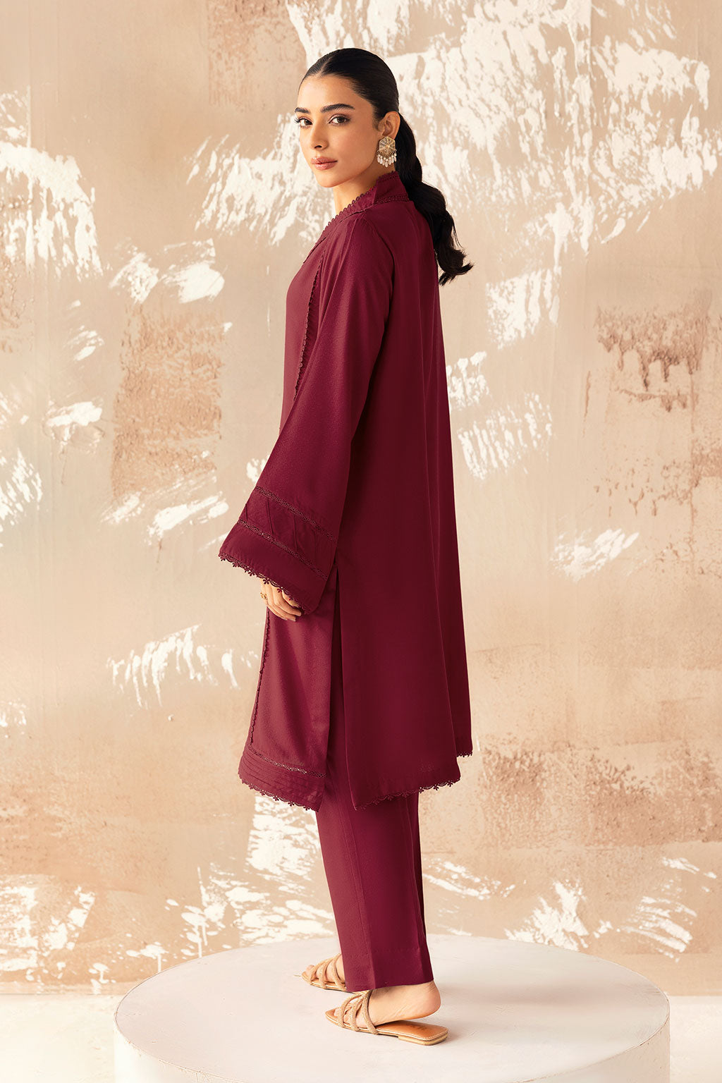 Effortlessly elegant, this deep maroon karandi outfit redefines winter grace with its sleek cut and refined detailing. A perfect blend of warmth and sophistication.