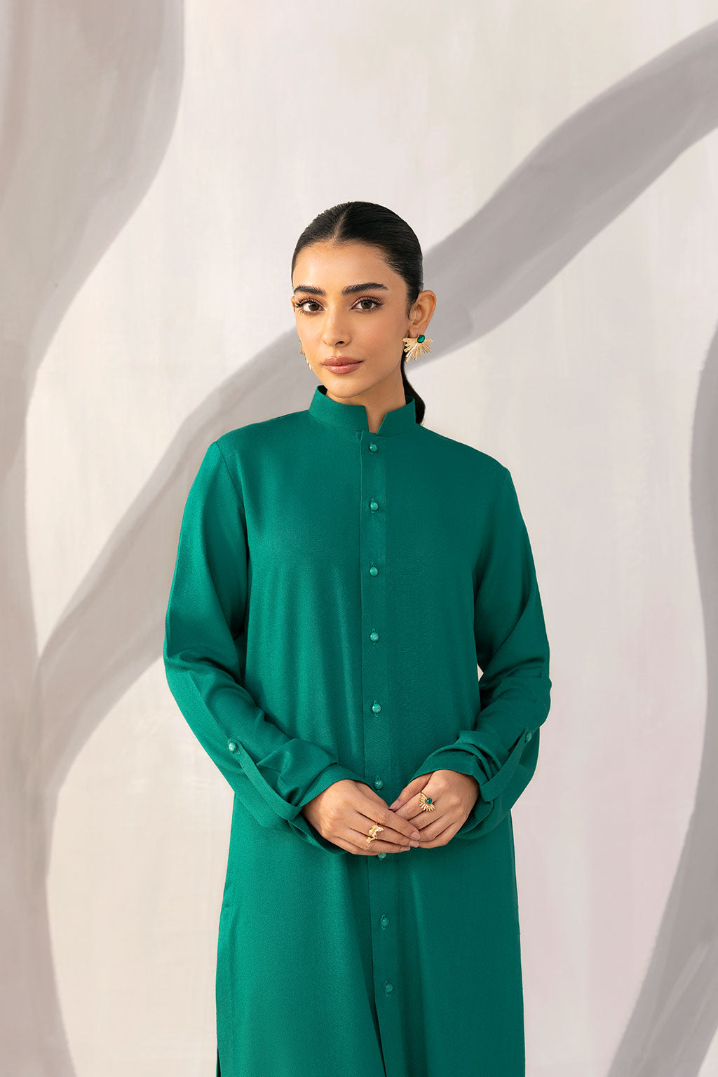 A classic teal karandi ensemble featuring a button-down front and band collar, offering a polished winter look. Its relaxed fit and full sleeves ensure comfort while maintaining refined sophistication.