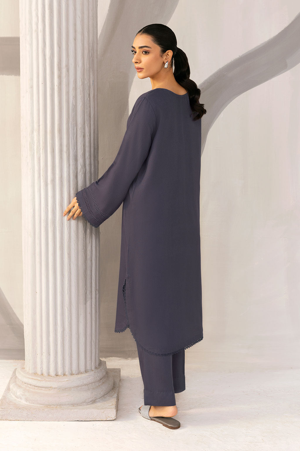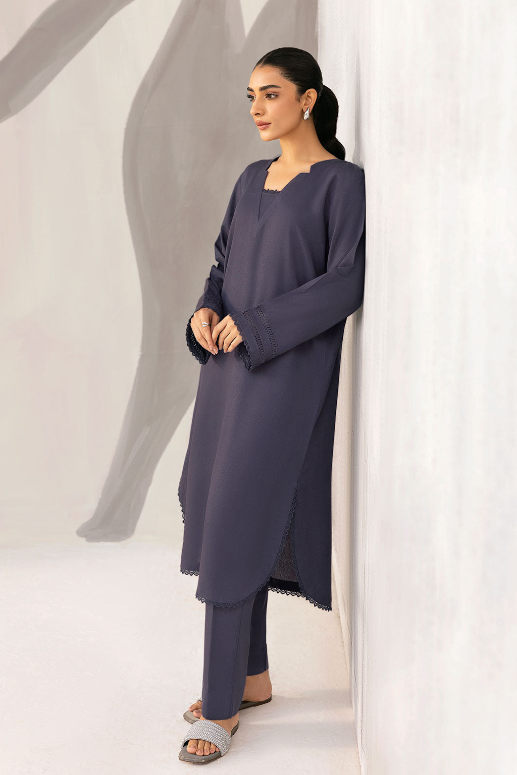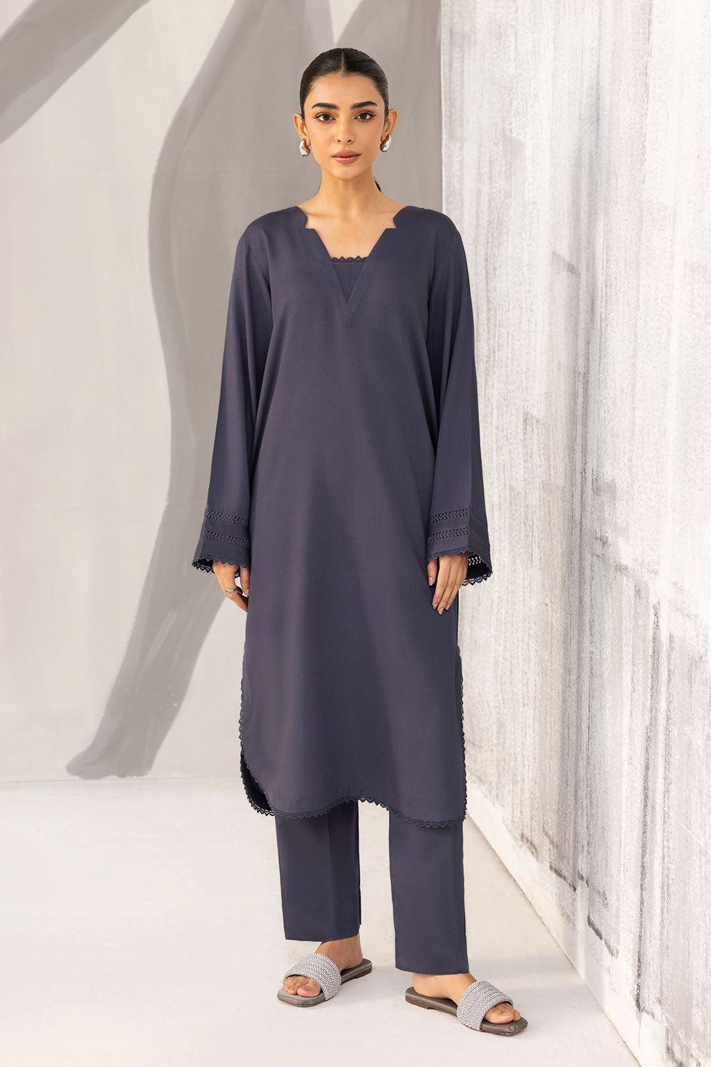A timeless winter essential crafted from premium Karandi fabric, this deep charcoal 2-piece features a scalloped hem and delicately detailed sleeves for a refined, minimalist look. Perfect for effortless elegance and cozy seasonal style.