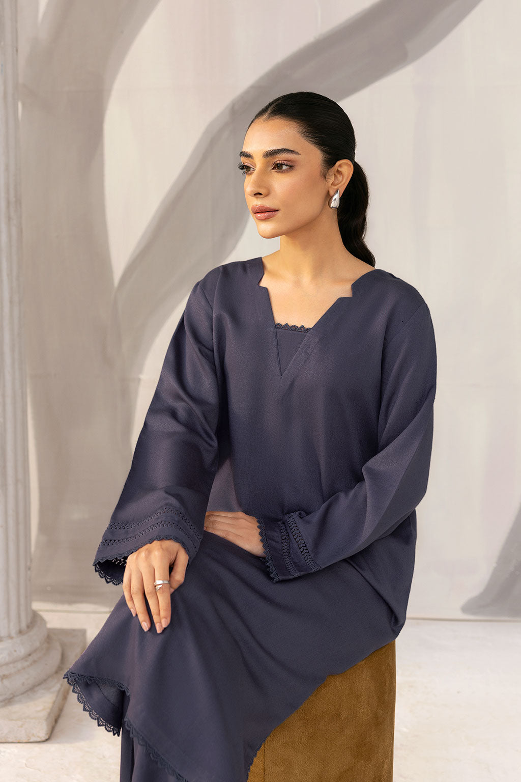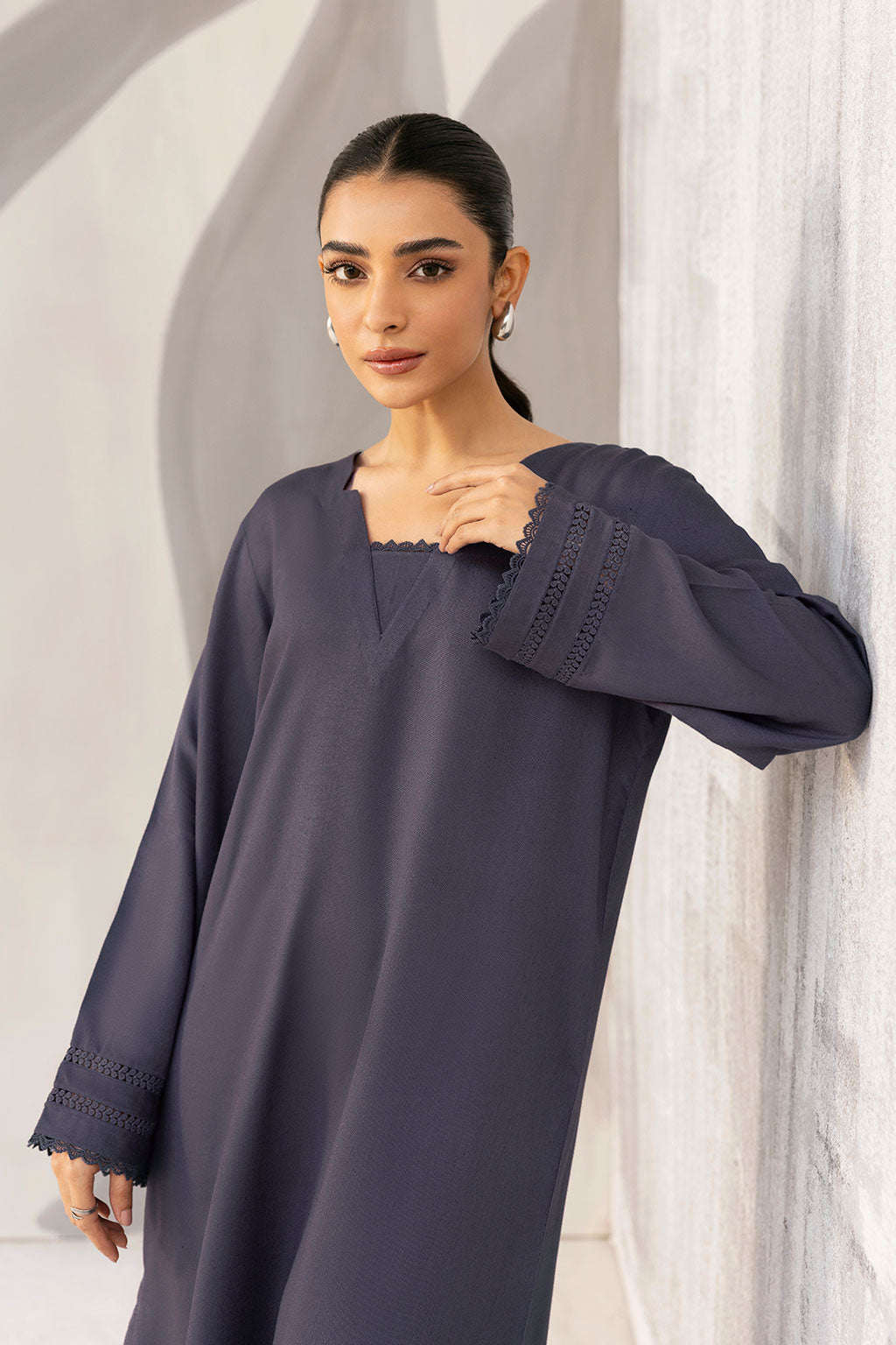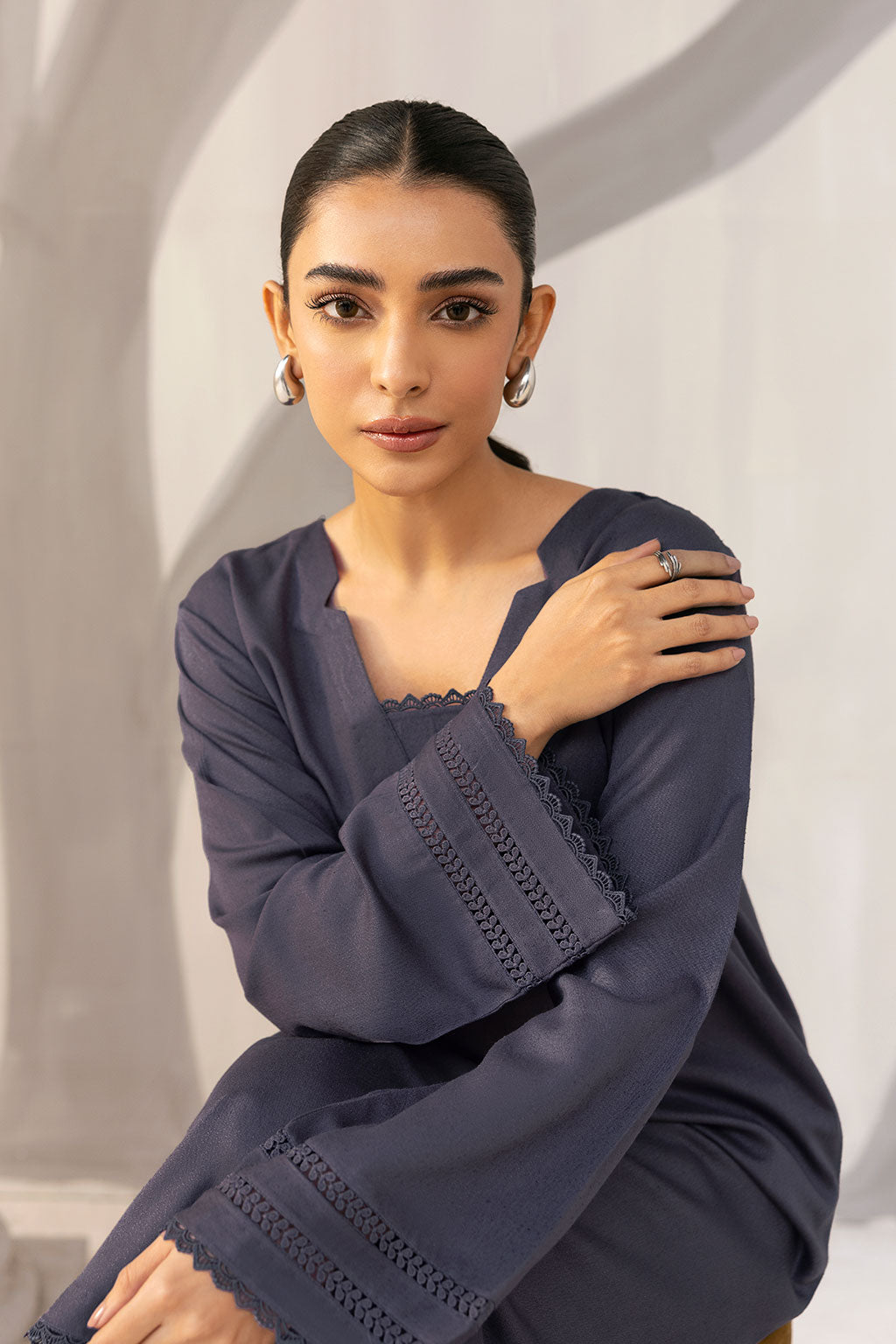 A timeless winter essential crafted from premium Karandi fabric, this deep charcoal 2-piece features a scalloped hem and delicately detailed sleeves for a refined, minimalist look. Perfect for effortless elegance and cozy seasonal style.