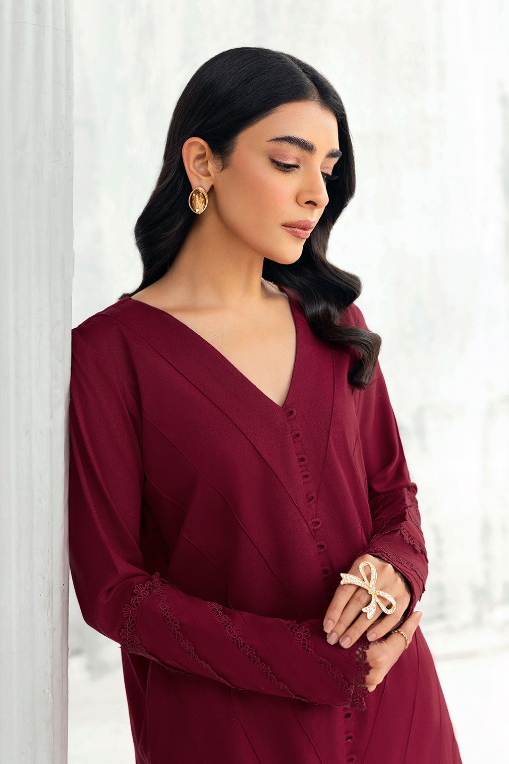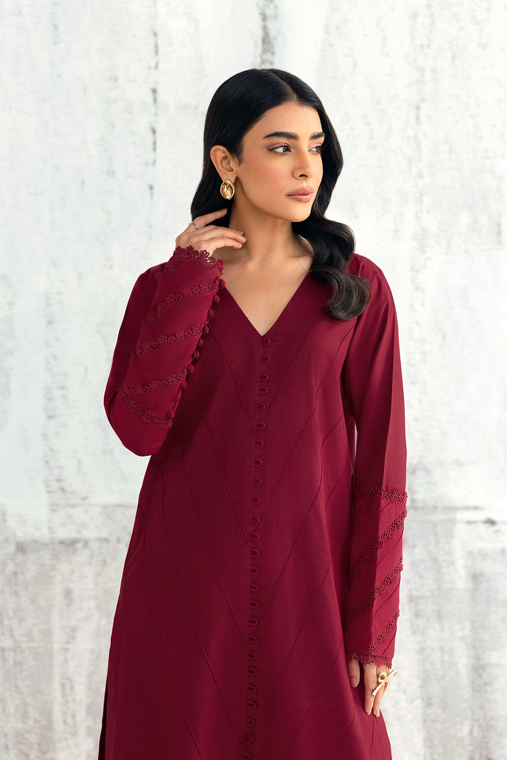 Draped in deep maroon elegance, this winter karandi ensemble blends warmth with sophistication. Its sleek silhouette and intricate sleeve detailing make it a timeless statement for the season.