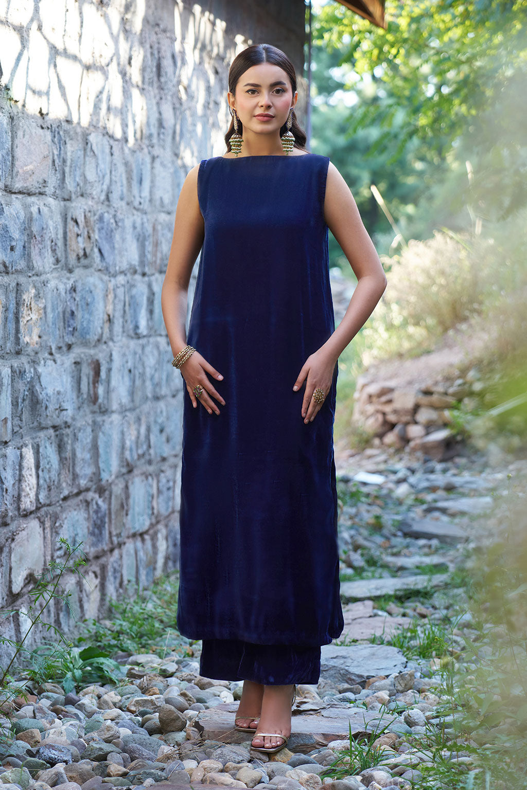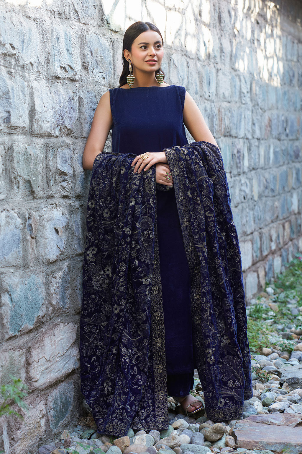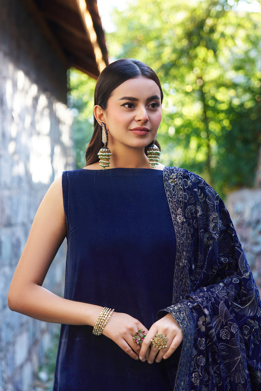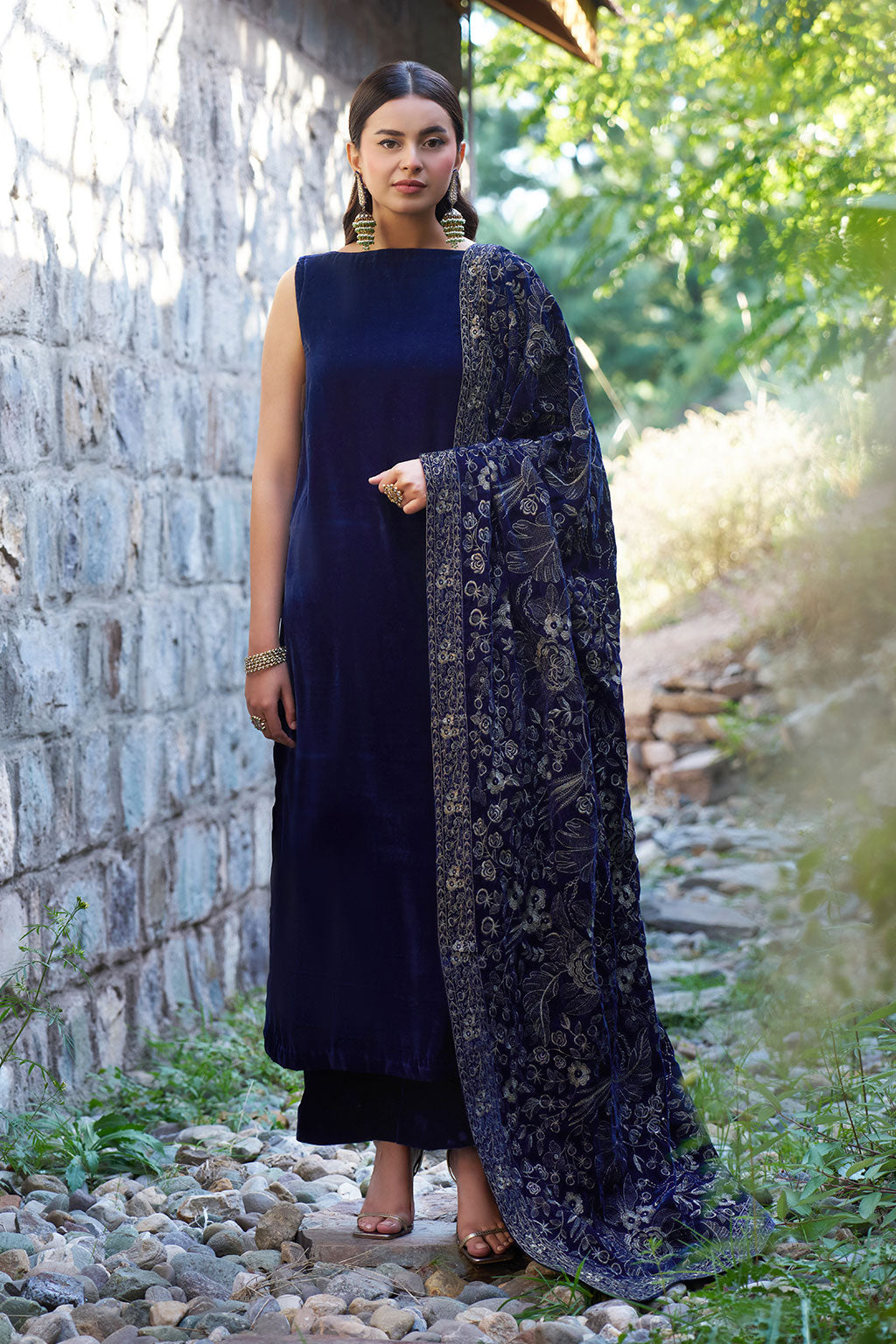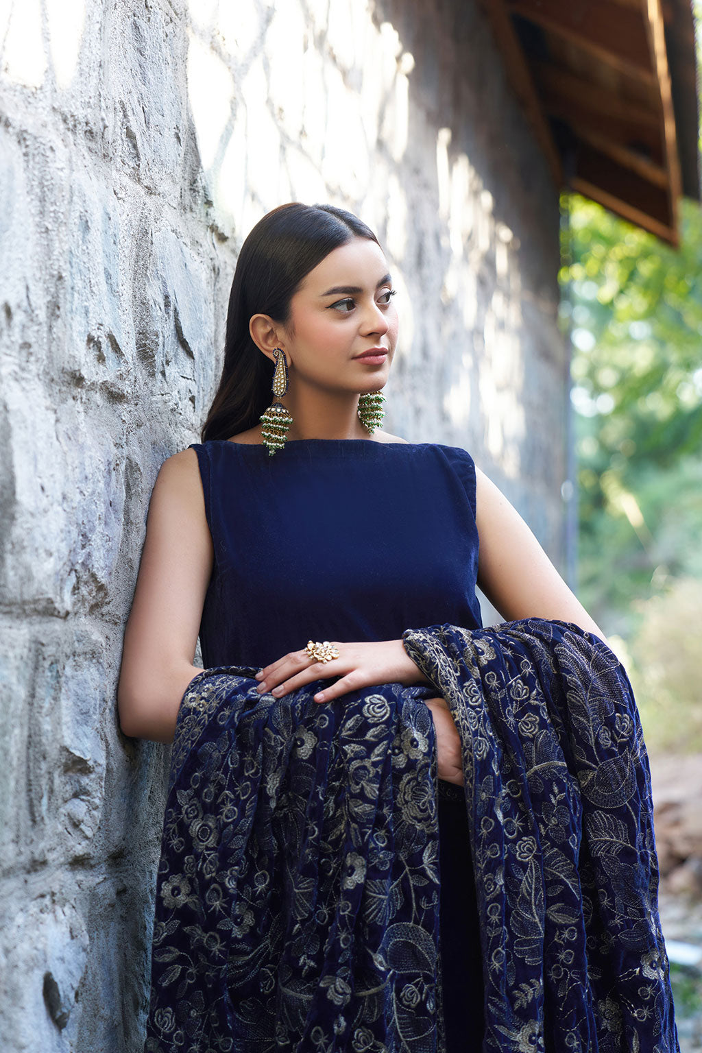 Indulge in winter sophistication with this luxurious royal blue velvet creation. The sleeveless silhouette and elegant boat neckline exude refined grace, while the richly embroidered shawl drapes beautifully to add a touch of timeless festive allure. A perfect harmony of regal charm and contemporary elegance.