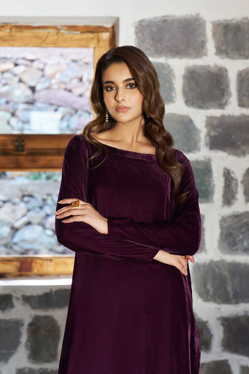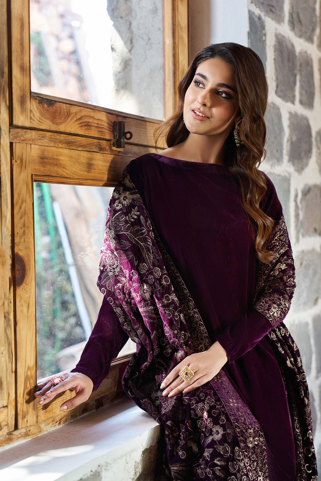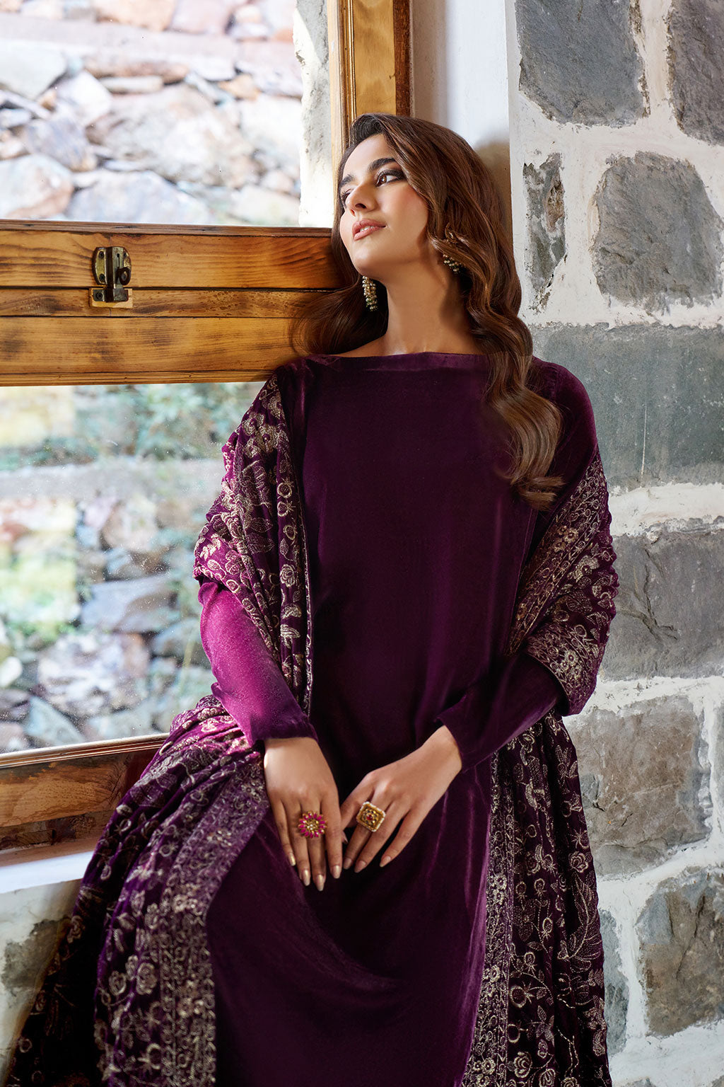 A purple plum velvet outfit featuring a round neckline, paired with matching trouser. Radiating effortless winter elegance. Styled with an intricately embroidered shawl for a touch of festive grandeur.